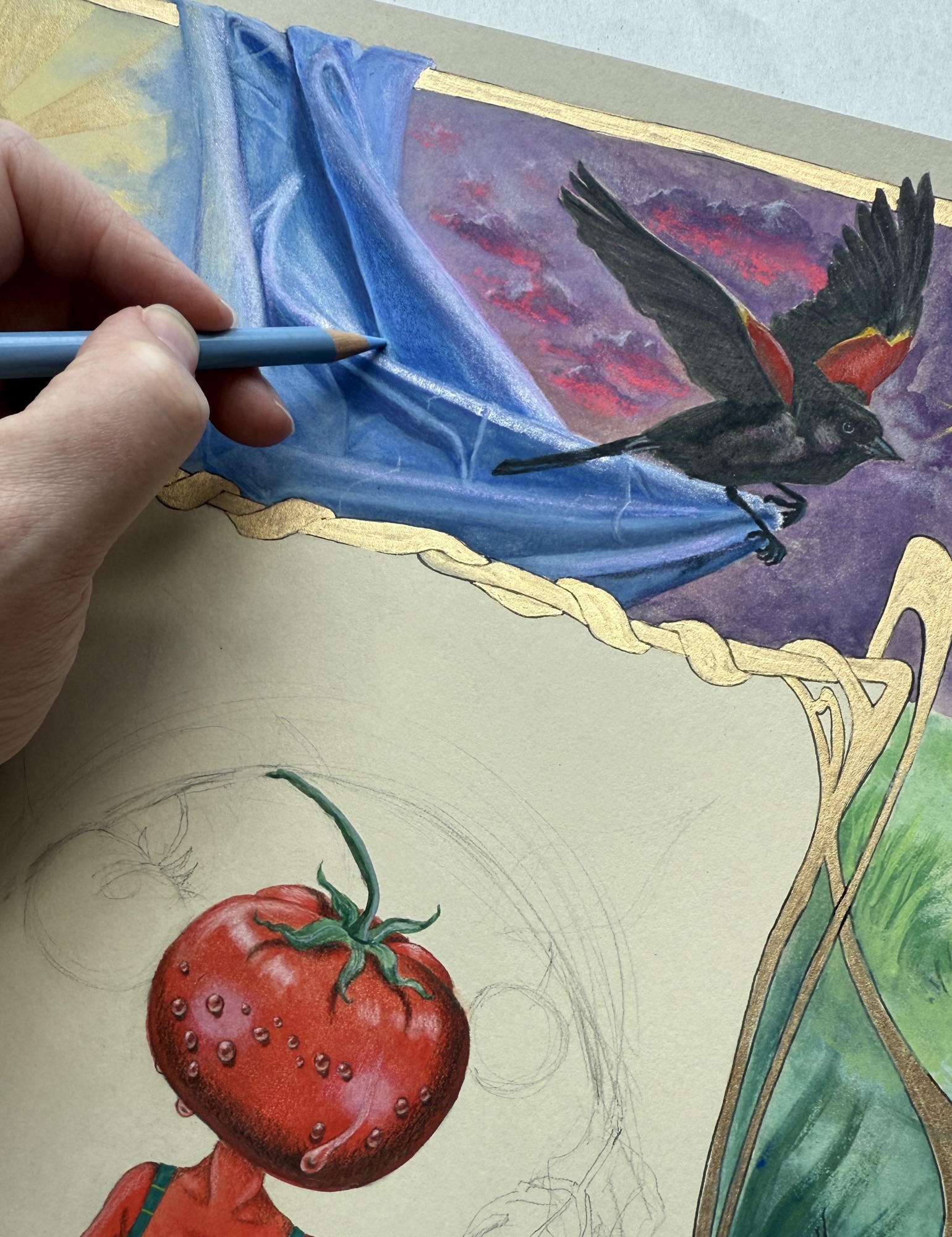A red-winged blackbird drapes over a new day. A fresh start. A new beginning. Real pressed fuchsia flowers and snowdrops drape over gouache painting. The tomato girl looks up to the sun with hope, her tears turning to dew drops. The moon was inspired by a grandfather clock found in a bookshop. The bottom right corner vignette shows a group of tiger moths radiating in a circle, their closed wings showing off their beautiful art deco design. This moth corner is actually where I started this painting an was an attempt to let go of control and just do. I know so many people going through some hard times, and have been through some myself, and I realize now that I wanted to make colorful, whimsical, sometimes a bit surreal, and hopeful work to brighten the day for whoever may view it.