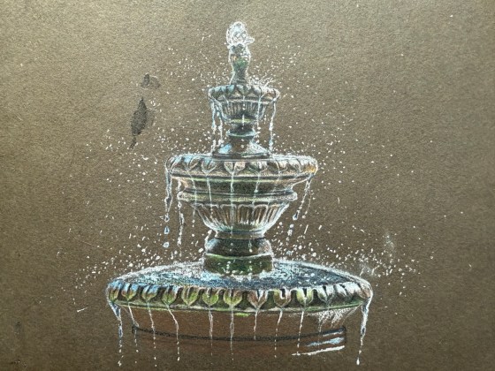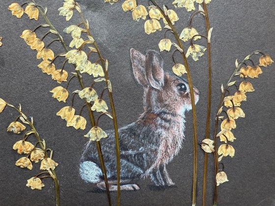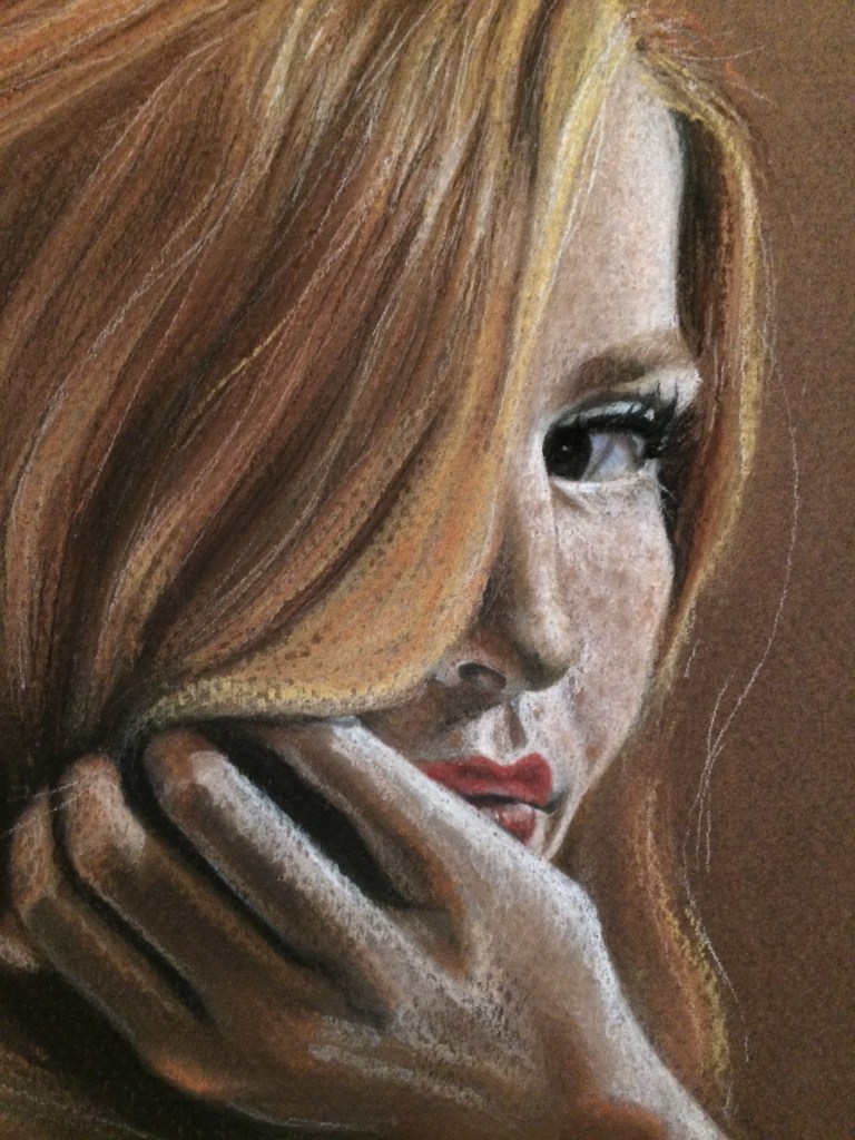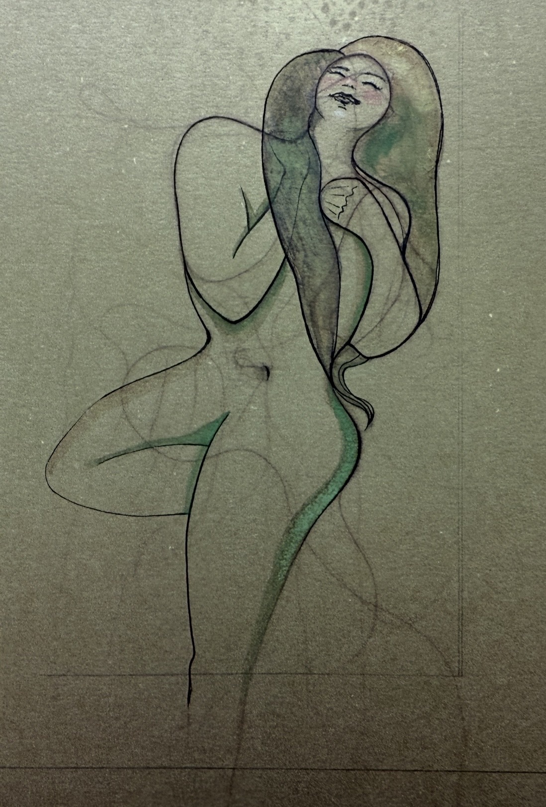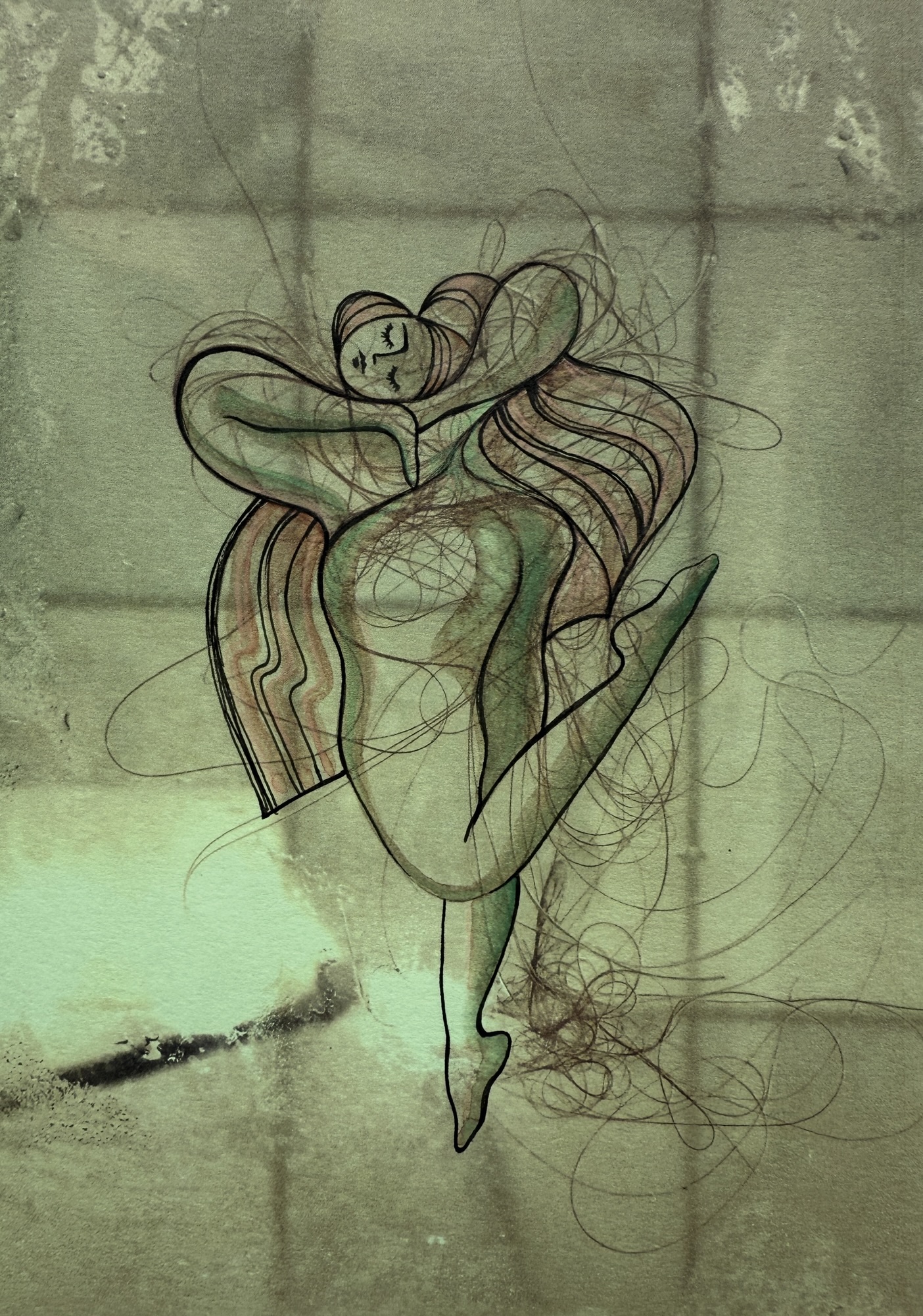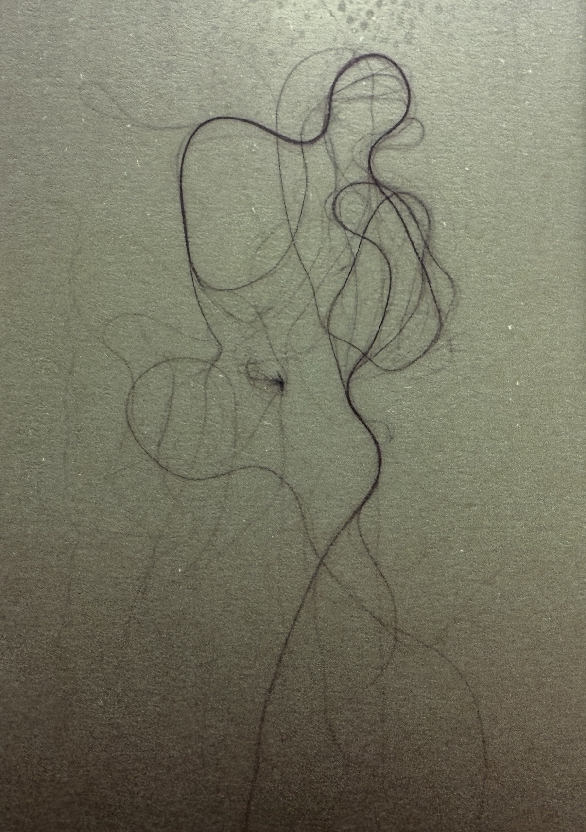 I thought it would be funny to bring to light a beautiful little figure from the flowing organic lines of the…hair wad. Very few lines were added and most are traced over actual lines of hair in the photograph.