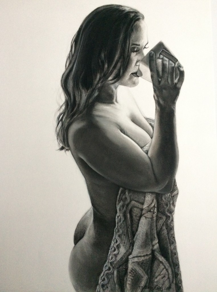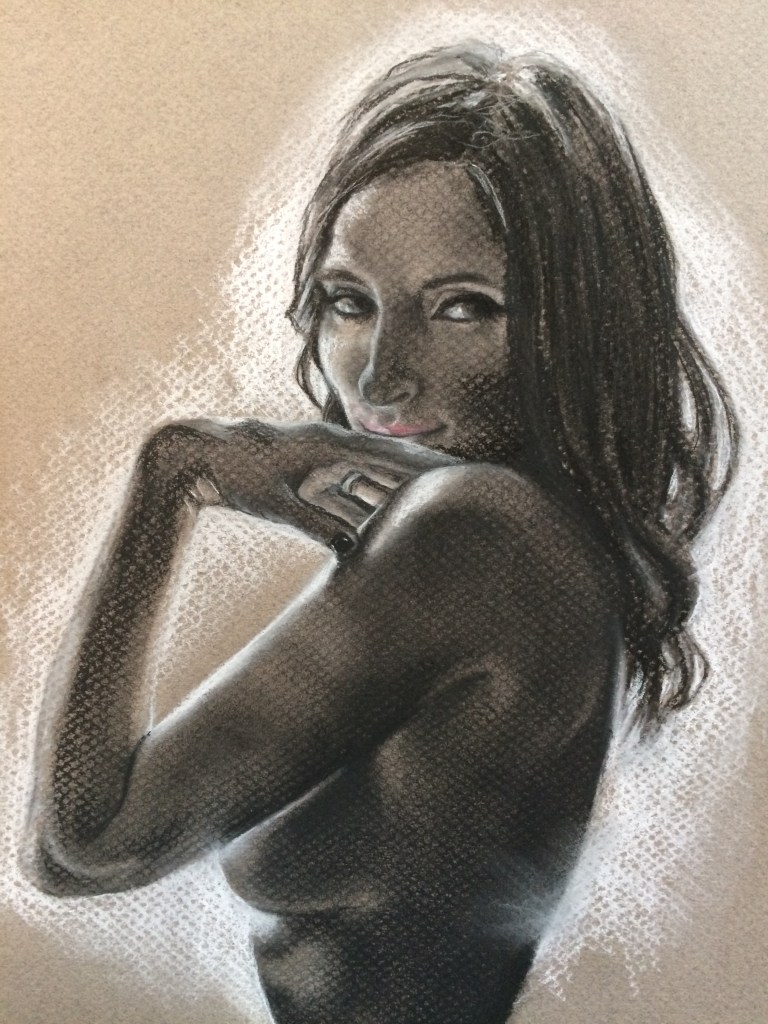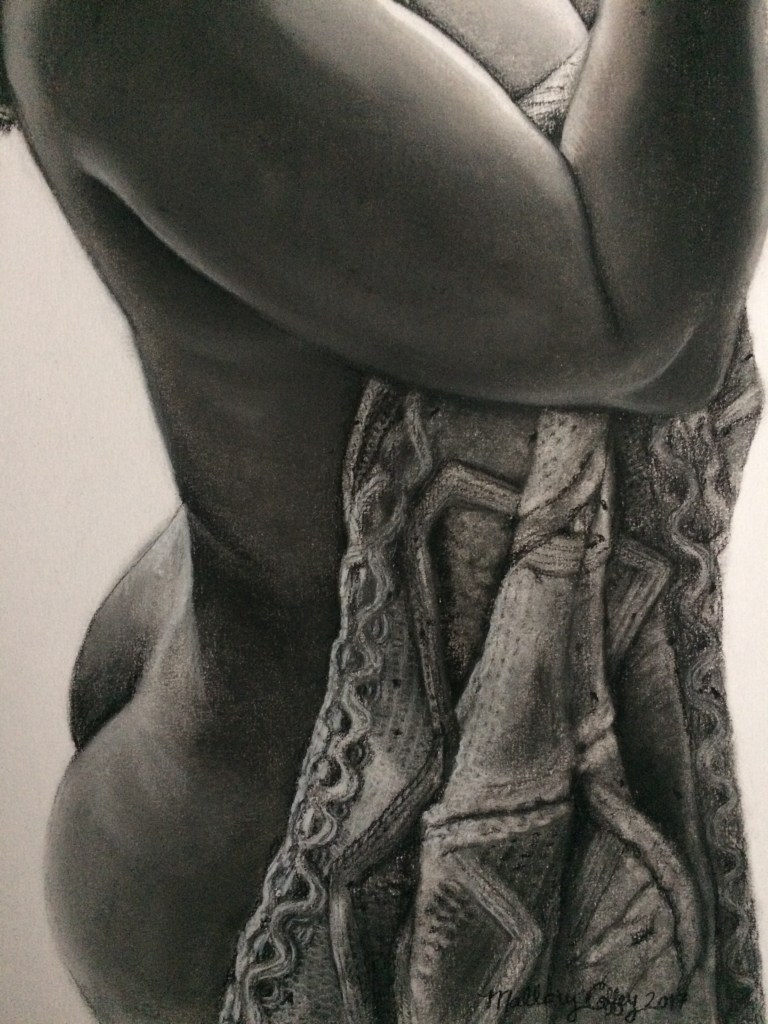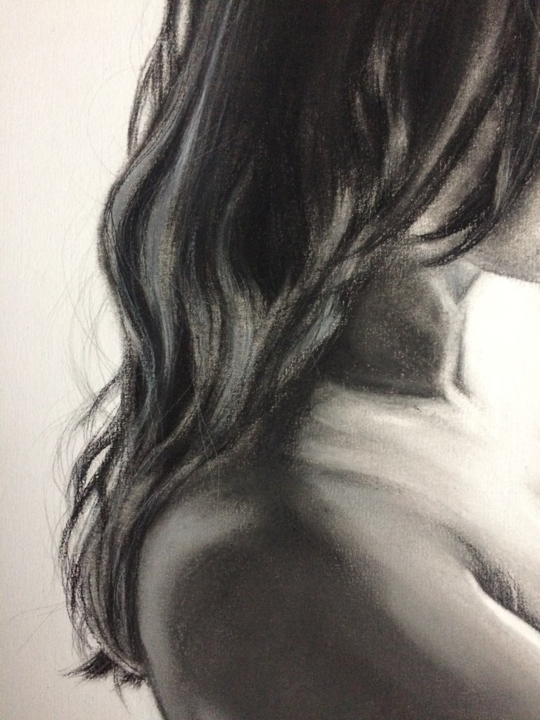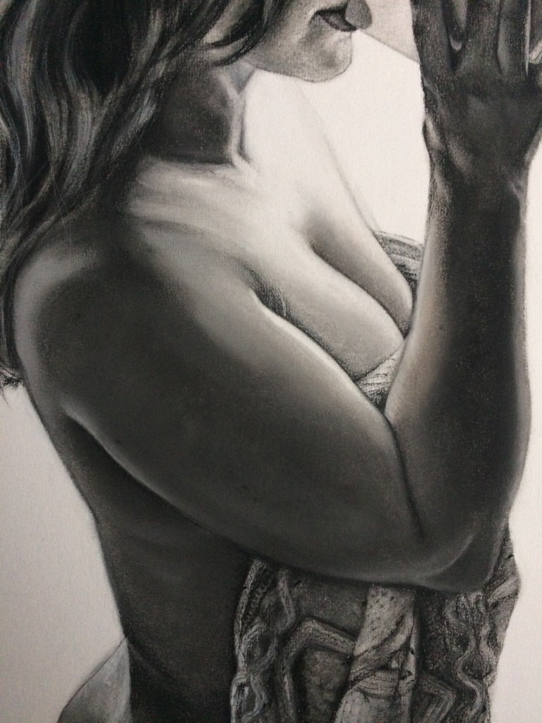 A back exposed can be both vulnerable and can also be a source of strength. The haze created by the erased charcoal gives a sense of anxiety that can cloud and surround us. This piece and the one above are an exploration in capturing the two seemingly contradictory feelings I was experiencing in becoming a mother which was both incredibly empowering, but was also the most vulnerable I have ever felt in my life.