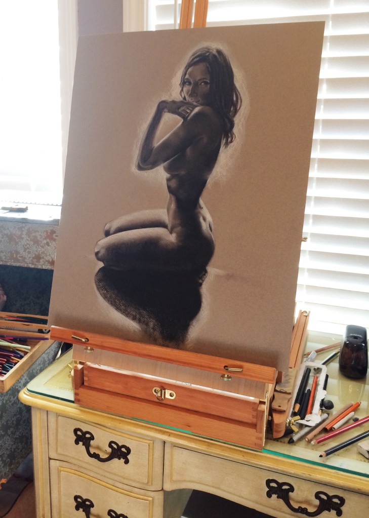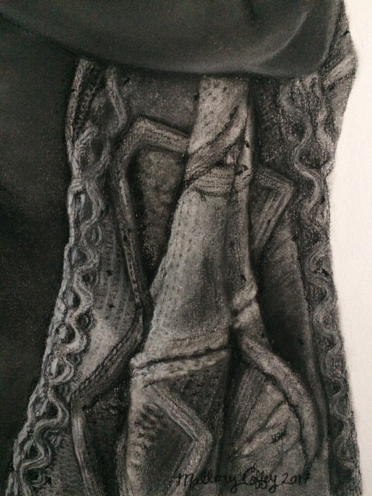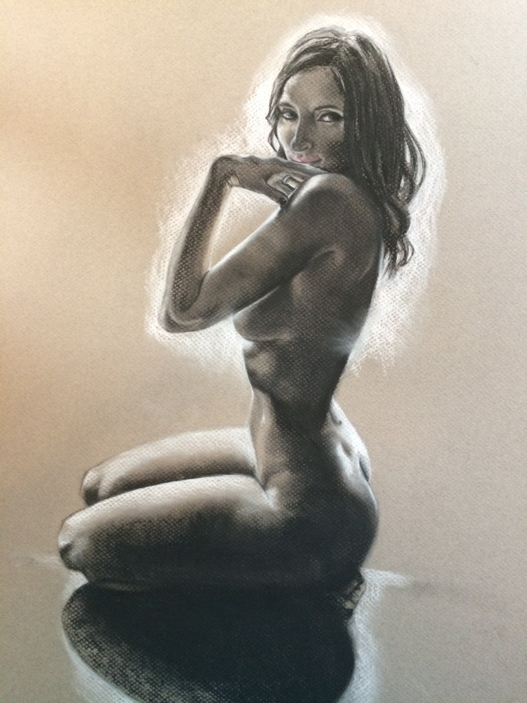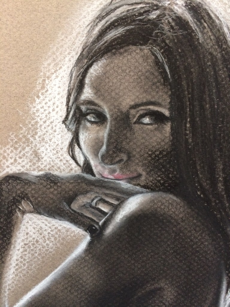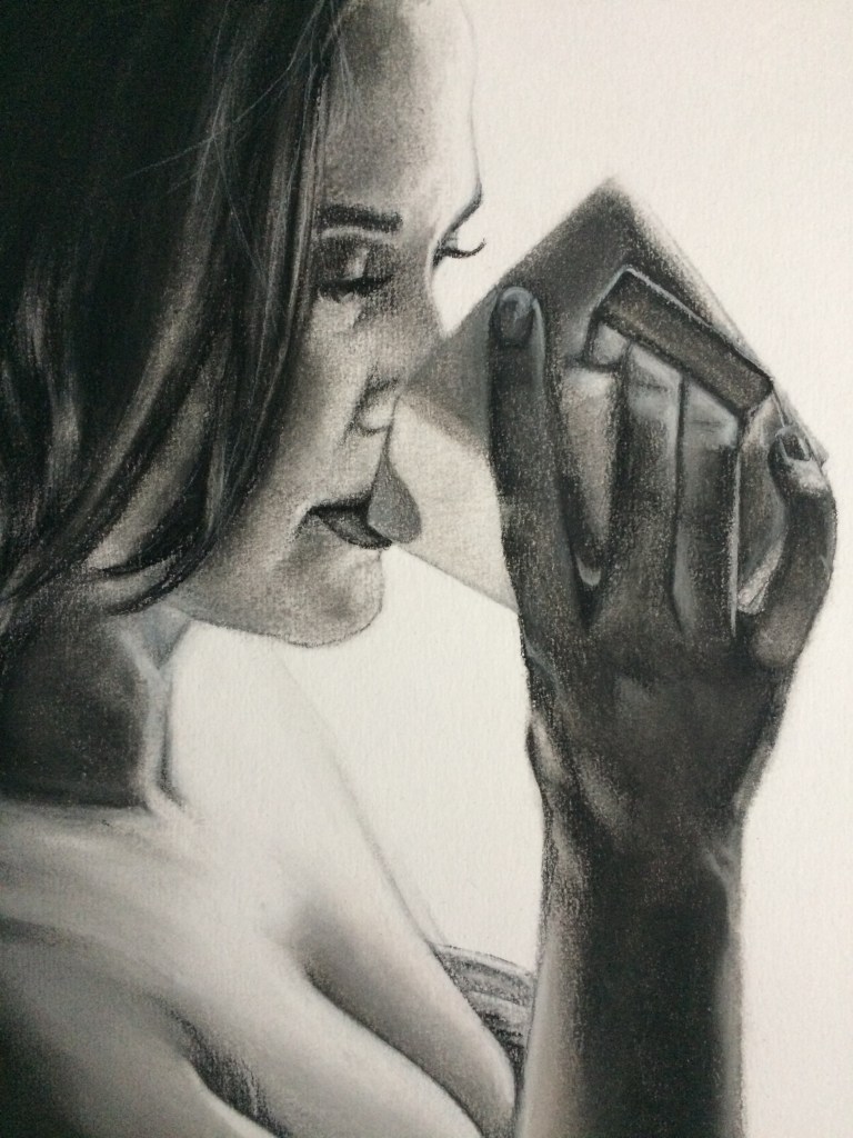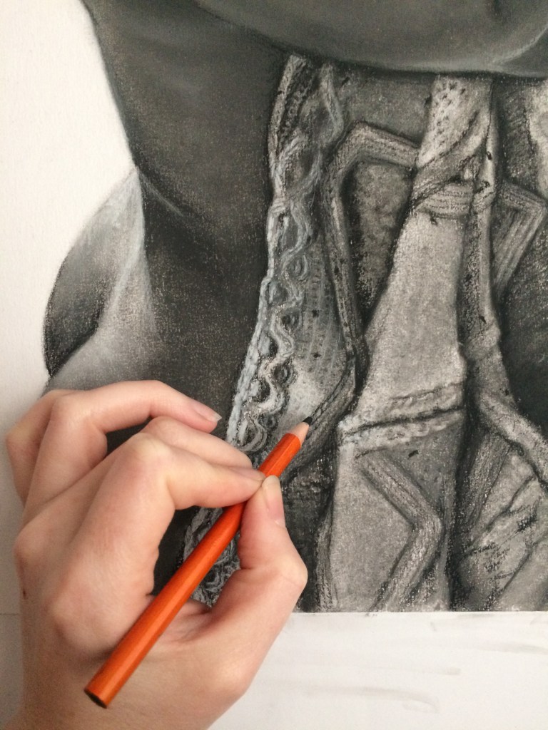 A back exposed can be both vulnerable and can also be a source of strength. The haze created by the erased charcoal gives a sense of anxiety that can cloud and surround us. This piece and the one above are an exploration in capturing the two seemingly contradictory feelings I was experiencing in becoming a mother which was both incredibly empowering, but was also the most vulnerable I have ever felt in my life.