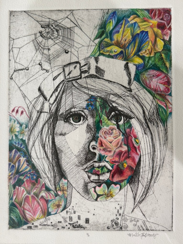 As new students to intaglio etching, our professor told the class to take our brand new, shiny, zinc plate…and beat the crap out of it. Throw it down the sidewalk, run over it with your car, do whatever you want to scratch the surface. Why? There’s nothing more intimidating than a blank slate. A perfect surface. Sometimes, making that first mark is the hardest part. By scratching up the surface, that worry of the first mark has been taken care of for you. We were asked to compose an abstract image using those random scratches. I’m not very good at abstract. I have a hard time connecting to it and especially creating it, so asked permission to use a representational image as an outline and create something abstract-ish on the inside using symbols and patterns that are meaningful to me.