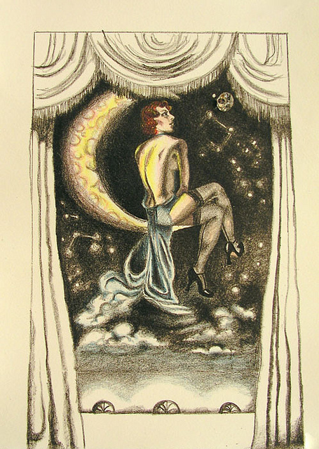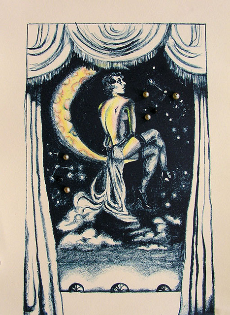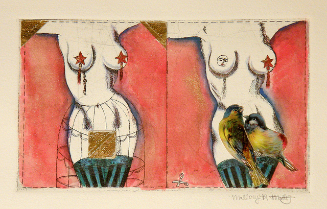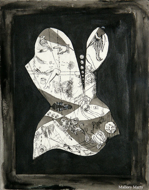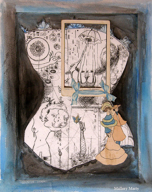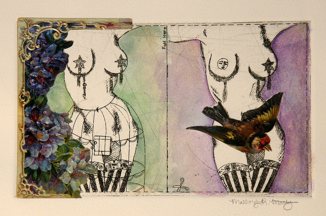 Frills and Thrills is my first attempt at encaustic painting which is painting with heated wax. Pigments can be added to the wax or it can be used in its original state as I did above. Within the wax I layered a print, vintage garter clips and a shoe buckle. Encaustic painting provides endless opportunities for experimentation and I look forward to trying my hand at more techniques.