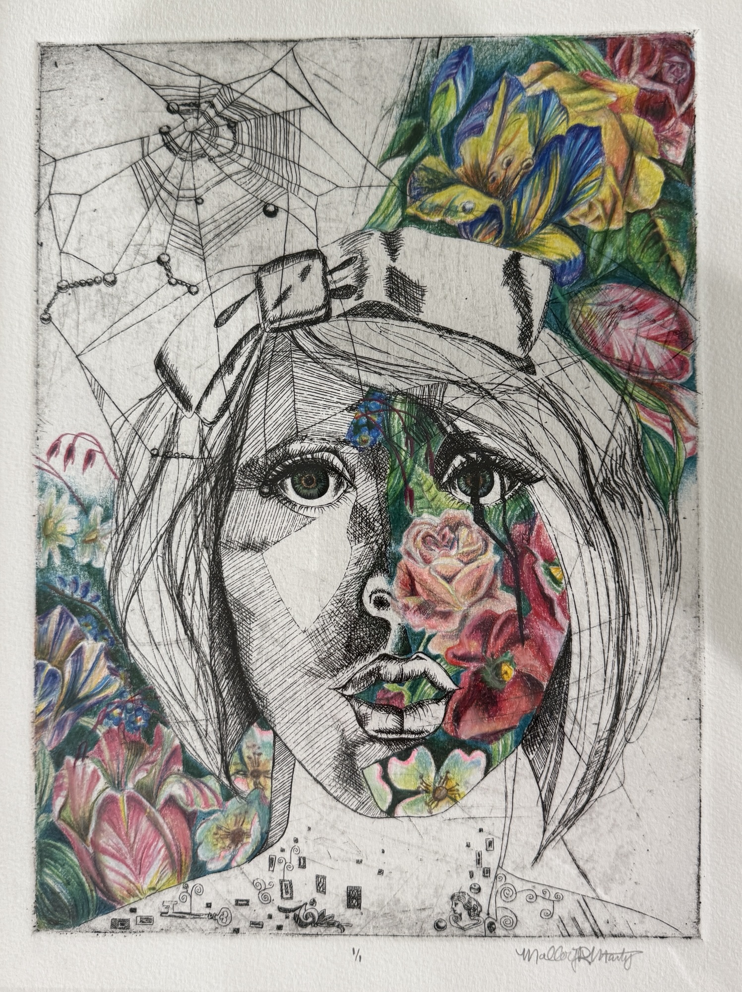 As new students to intaglio etching, our professor told the class to take our brand new, shiny, zinc plate…and beat the crap out of it. Throw it down the sidewalk, run over it with your car, do whatever you want to scratch the surface. Why? There’s nothing more intimidating than a blank slate. A perfect surface. Sometimes, making that first mark is the hardest part. By scratching up the surface, that worry of the first mark has been taken care of for you. We were asked to compose an abstract image using those random scratches. I’m not very good at abstract. I have a hard time connecting to it and especially creating it, so asked permission to use a representational image as an outline and create something abstract-ish on the inside using symbols and patterns that are meaningful to me.